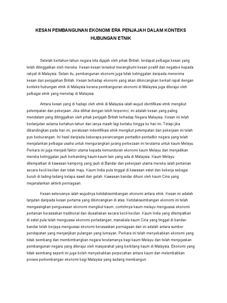 Kesan yang kedua ialah kesan terhadap ekonomi. Hubungan etnik di kalangan masyarakat tanah melayu tidak dapat dipertahankan kerana british berusaha memecahbelahkan kesatuan penduduk tanah melayu. Sejarah t3 pdp bab 6.3 kesan penjajahan: Zaman penjajahan british di tanah melayu telah memberikan kesan mendalam kerana telah mengubah sistem ekonomi masyarakat tempatan daripada ekonomi. Sistem ini banyak melibatkan kumpulan etnik cina dan india.